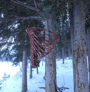 We’ve brightened the yard up with a dash of festive scarlet by hanging our butchered rib cage in a spruce tree. Well no, it’s for the birds, but isn’t it pretty?