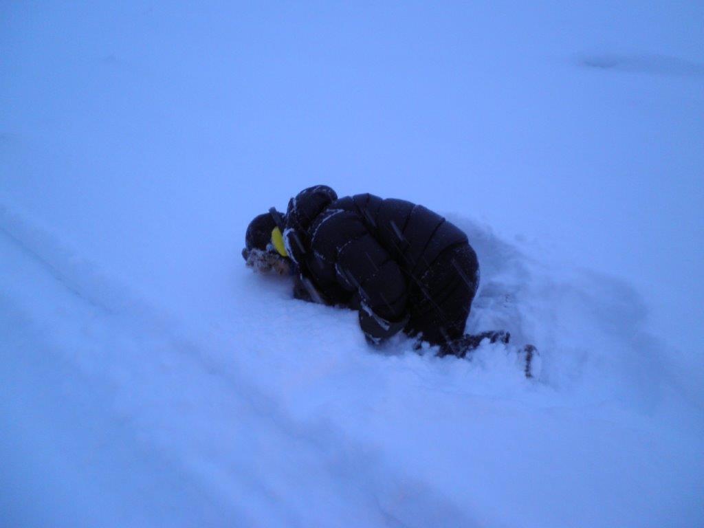 I don’t think I’ve explained the full excruciating ordeal of “walking”. It’s not walking. It’s staggering, falling, getting up and stumbling on. The trail is not packed down yet but it is obscured by snow. So each step forward on to the smooth white is a guessing game.
